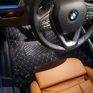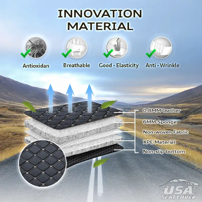 Fabricadas con  cuero vegano ultraduradero ,  espuma viscoelástica  suave  , resina de polipropileno con propiedades resistentes y una base de panal antideslizante  ,  nuestras alfombrillas  mantienen el agua y la humedad fuera del  piso de su vehículo. Proporciona  protección antideslizante  al conducir.